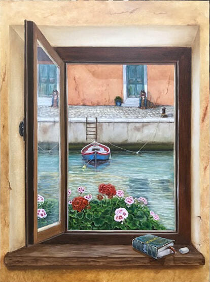 "A Fisherman's Chores" is a window view of a canal, typically Mediterranean, in "Trompe L'oeil" style. The view looks out on to an everyday scene of a fisherman on the opposite side of the canal, repairing his nets in front of his home. His fishing boat is anchored below. Boxed geraniums, typical of many homes along the Mediterranean coastline, decorate the window frame, and a book entitled "Memoires" sits on the window sill. The artwork captures the essence and simplicity of a fisherman's daily routine, in the context of a calm and inviting waterside space.