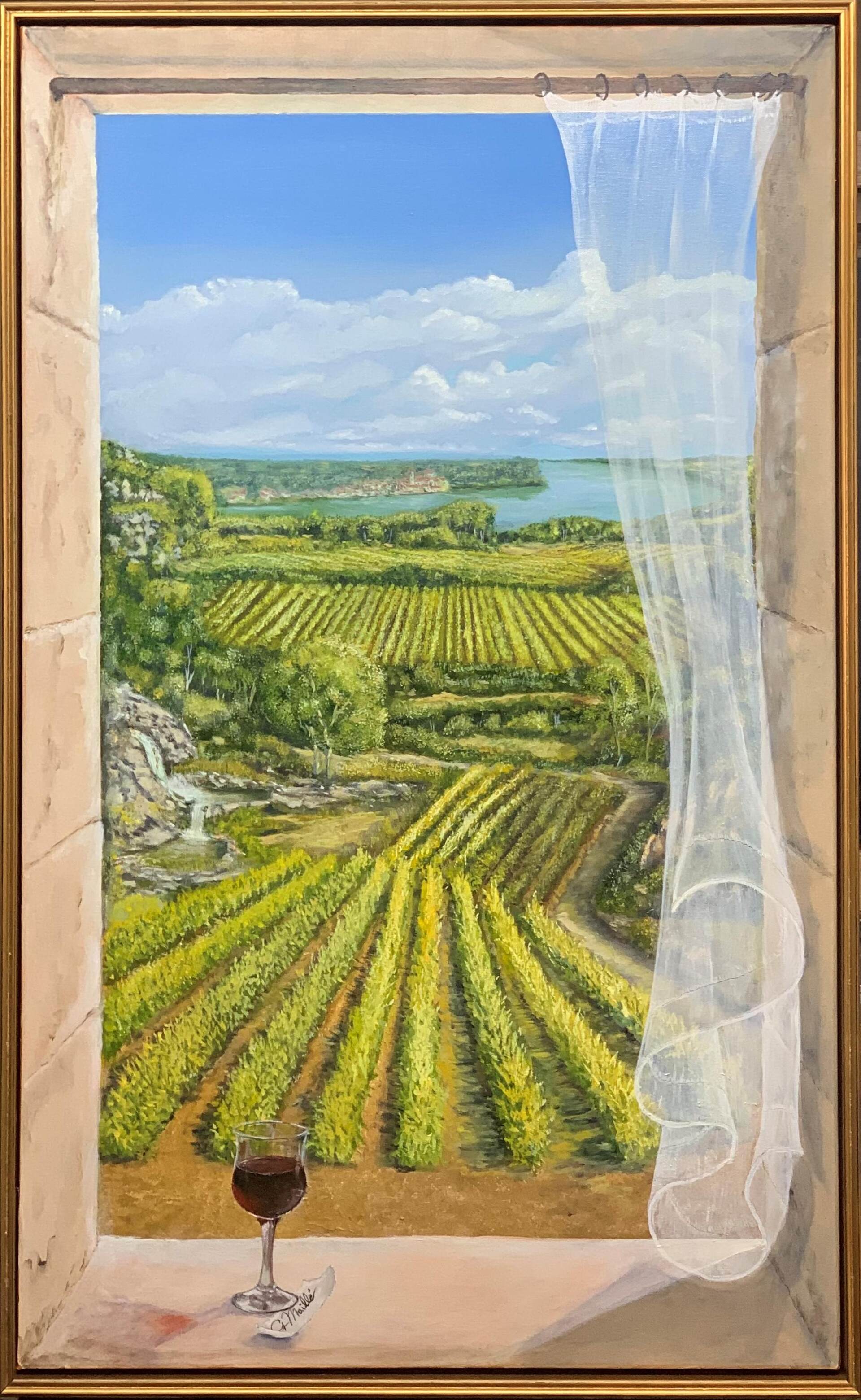 "A Moment of Peace" is a "Trompe L'oeil" depicting a European inspired view from an old stone window. The scene features a vast vineyard arranged in neat rows, stretching towards a body of water in the distance. A small town with red-roofed buildings is nestled near the shore. The use of a sheer, white curtain blowing in the breeze adds a sense of movement and tranquillity to the piece. On the window's ledge, a glass of red wine adds a touch of elegance and enhances the theme of a vineyard view.