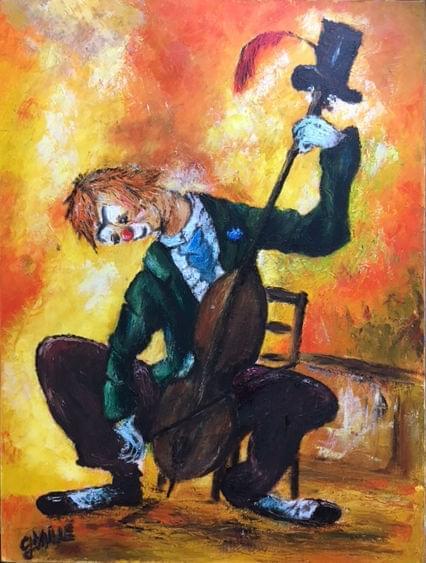 "Clown's Serenade" is a vibrant and captivating oil painting measuring 61 x 46 cm. This piece comes to life with the joyful depiction of a clown engrossed in the act of playing a cello. Adorned with a red nose and exaggerated makeup, the clown wears a kaleidoscope of colours—featuring a green jacket, blue bowtie, and oversized shoes. Adding to the character’s whimsical charm, one hand gracefully holds a black top hat with a striking red feather, while the other hand is positioned on the cello, ready to pluck the strings and release the music.