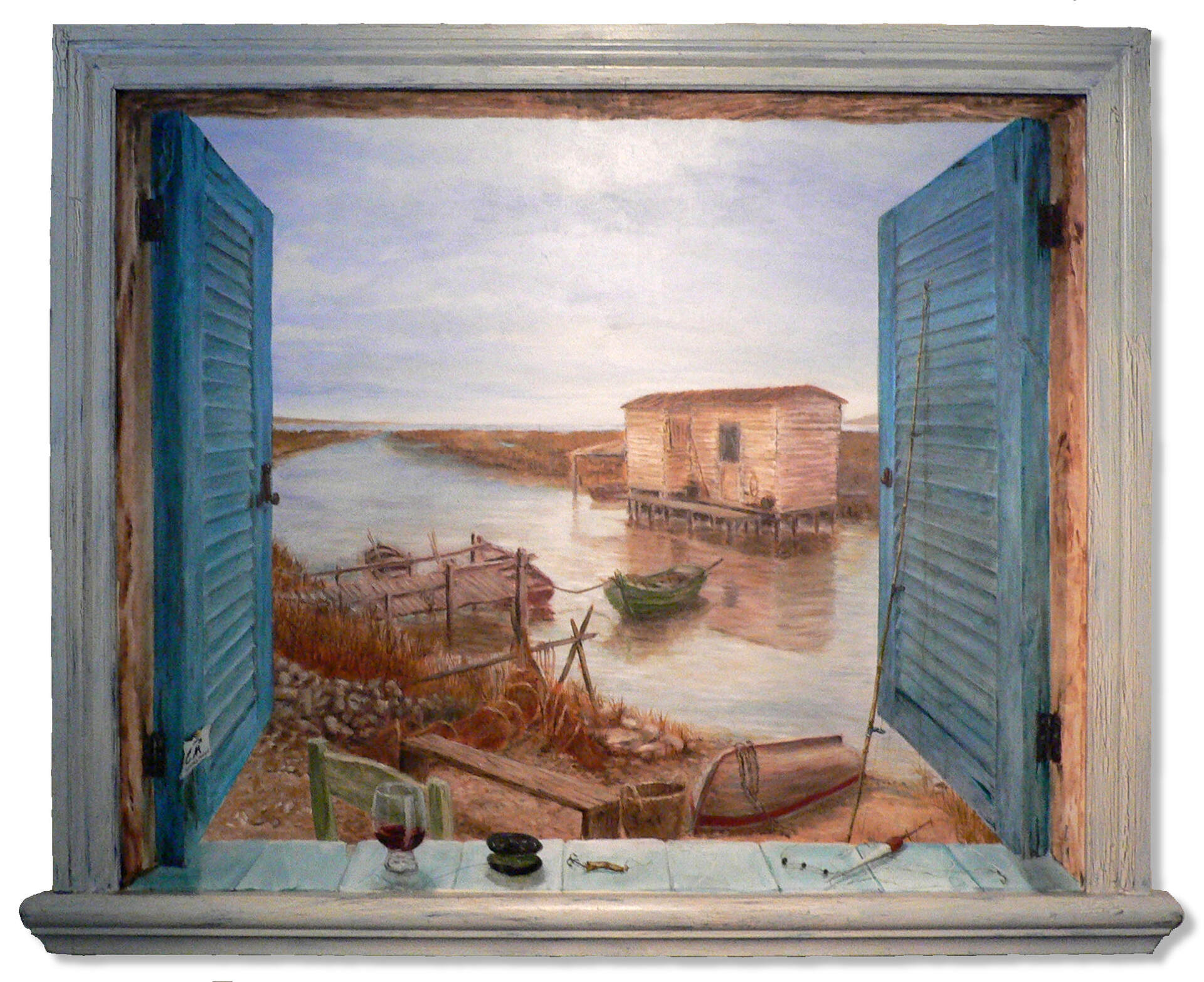 This painting evokes childhood memories of natural canals, which can be found along the Mediterranean coast of France, and where fishing huts would mysteriously appear in the general landscape, so often no one knowing who they belonged to.An outside working area showing an upturned boat, chair, bench, basket and fishing nets is seen in the foreground as part of the shore opposite the hut, and beyond that is an old jetty where two fishing boats are moored.The scene is viewed from a window of another fisherman's hut, with a whitish wooden frame and blue shutters, which are quite typical of the South of France. On the window sill sits a glass of red wine and some items of fishing gear.With its pale winter sky, the painting creates an atmosphere of still calmness and solitude.
