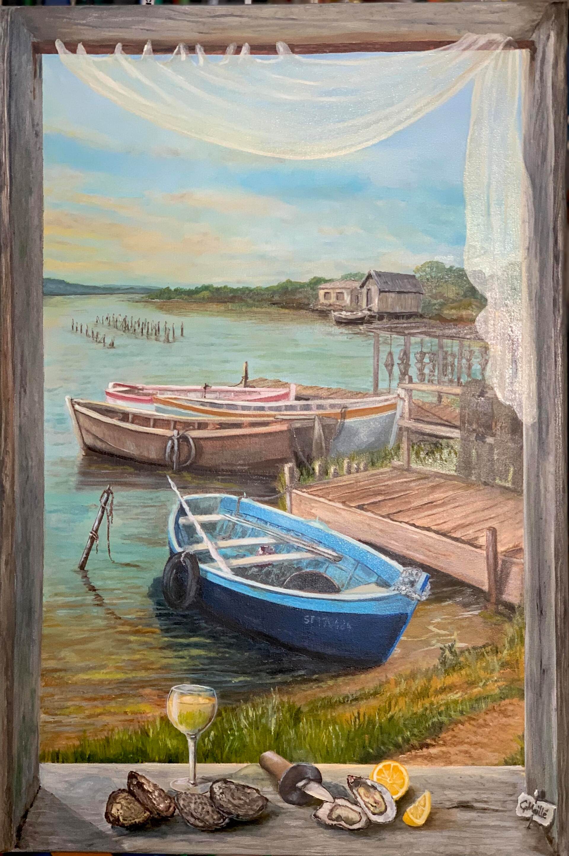 Step into a world of tranquil beauty with "Harbour Oysters", a mesmerizing "trompe l'oeil" that captures the essence of coastal serenity. Gaze through a window overlooking a calm body of water, where boats sway gently in the breeze and stilt houses stand in quiet homage to the sea. A scene bathed in the warm hues of a setting sun invites you to linger, to savour the moment and the subtle magic of the sea. With a delicate arrangement of oysters, wine, and lemon, the artist invites you to immerse yourself in a world of simple pleasures and ethereal beauty. Let "Harbour Oysters" transport you to a realm where time stands still and the sea whispers secrets of the soul.