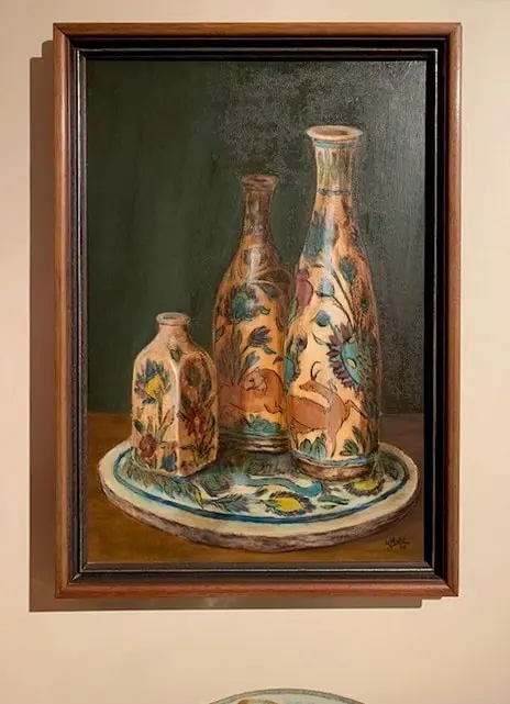This still life painting depicts an old pottery set, which I purchased during my travels in Iran some decades ago. It has been hand painted with animal, bird and flower designs.