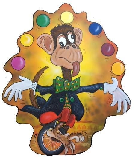Jester on Wheels captures a moment of playful energy and confident balance, bringing to life a spirited figure in mid-performance. The central character—a monkey dressed in a tailored ensemble of rich reds, deep blues, and a vibrant green bow tie—rides a unicycle with poised arms outstretched, exuding both control and joyous abandon. The tongue playfully sticking out adds a subtle touch of whimsy, inviting viewers to share in the light-heartedness of the scene.