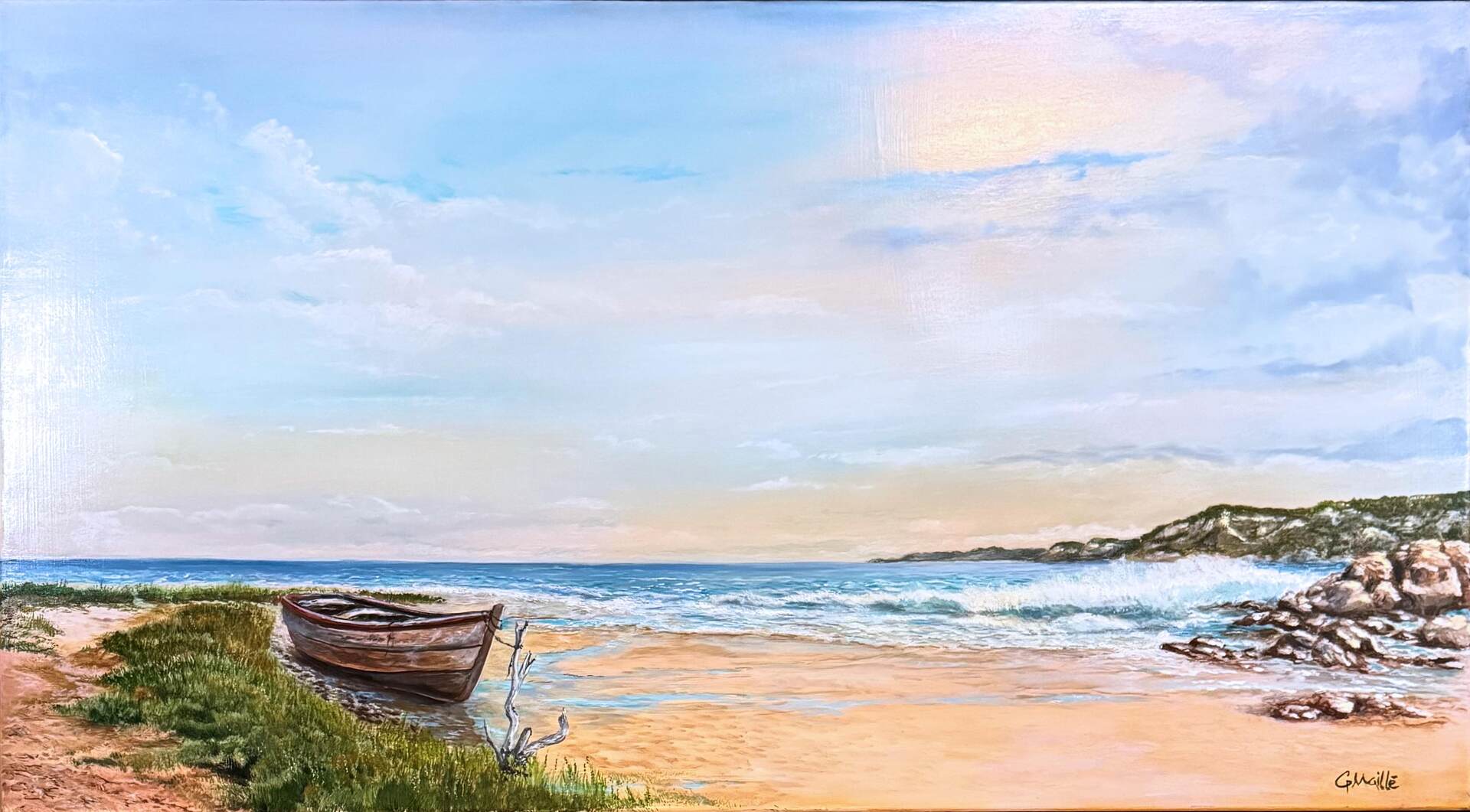 "Lost" is a serene seascape depicting a tranquil beach scene, capturing a moment of calm and solitude. In the foreground, a wooden boat rests quietly on a grassy shore, while the ocean extends out to the horizon, with gentle waves softly rolling in. The sky, with its soft blues and warm hues, is expansive and conveys a peaceful atmosphere.