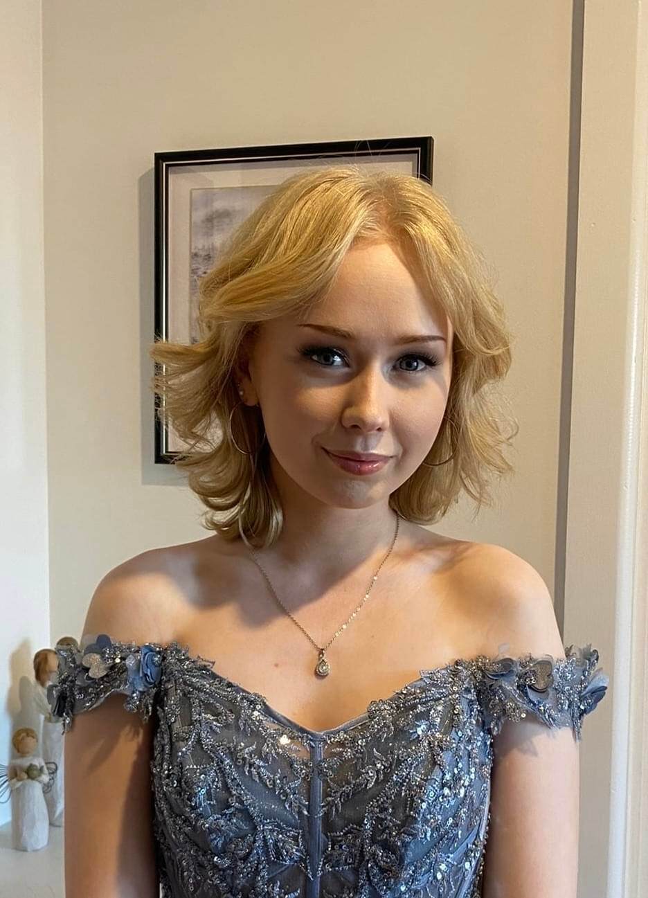 The central figure is adorned in an elegant blue lace dress, meticulously detailed with floral patterns on the shoulders, accentuating its sophistication. Her expression is confident and composed, framed by light makeup that enhances her natural features without overpowering them. A simple gold necklace with a small pendant further accentuates her refined appearance, adding a subtle yet significant element of elegance to the overall composition.