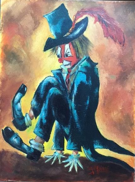"Melancholy in Masquerade" is a mesmerizing new painting that captures the contrasting essence of joy and sadness inherent in the life of a clown. Standing at 61 cm in height and 46 cm in width, this oil painting features a clown with wonderfully exaggerated features, draped in a top hat adorned with a striking red feather, a blue overcoat, and oversized shoes. The clown sits in a contemplative pose, inviting viewers to explore the depths of his introspection.