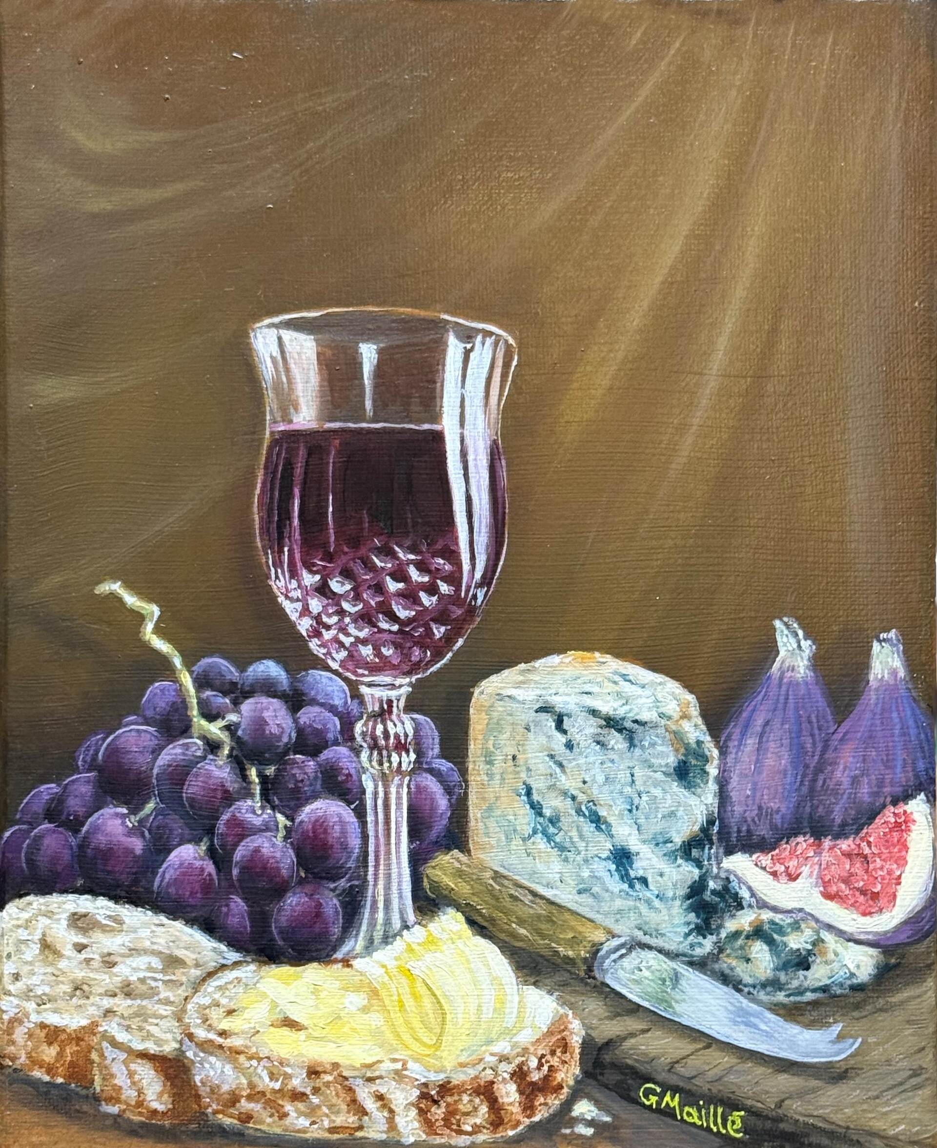 This still life painting invites the onlooker to relish the beauty of the present moment—a glass of sumptuous red wine surrounded by the lushness of dark purple grapes, the rich creaminess of blue cheese, and the allure of freshly sliced figs.