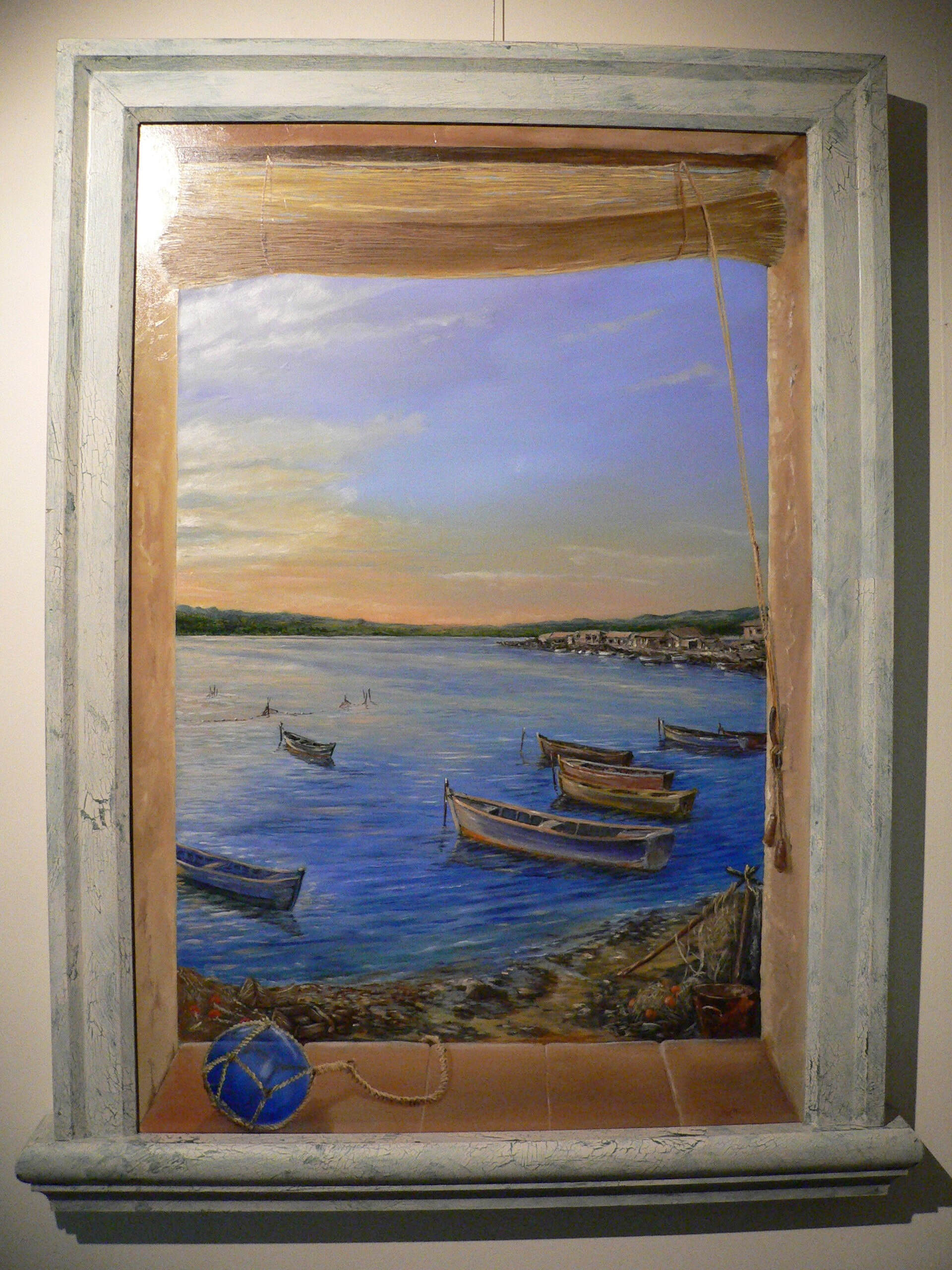 This "window effect" style painting shows a view out over a section of coastline along the Mediterranean Sea. It is early morning, and an array of fishing boats are moored ready for the day's departure. Nets are laid out to dry on the shore in the foreground. A sleeping village can seen in the distance. The scene evokes memories of childhood.