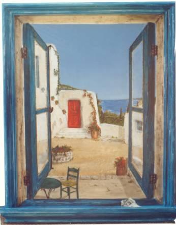 The window, custom built by Gerard, is typically blue for the region, creating a wonderful contrast with the white washed walls of the house. An air of mystery is created by the red door seen at the far end of a courtyard, so typical of coastal homes in this region. The age of the home is expressed through an old vine on the far wall and the worn state of the courtyard pavers. One can feel the history of the home and its eternal partner, the sea.