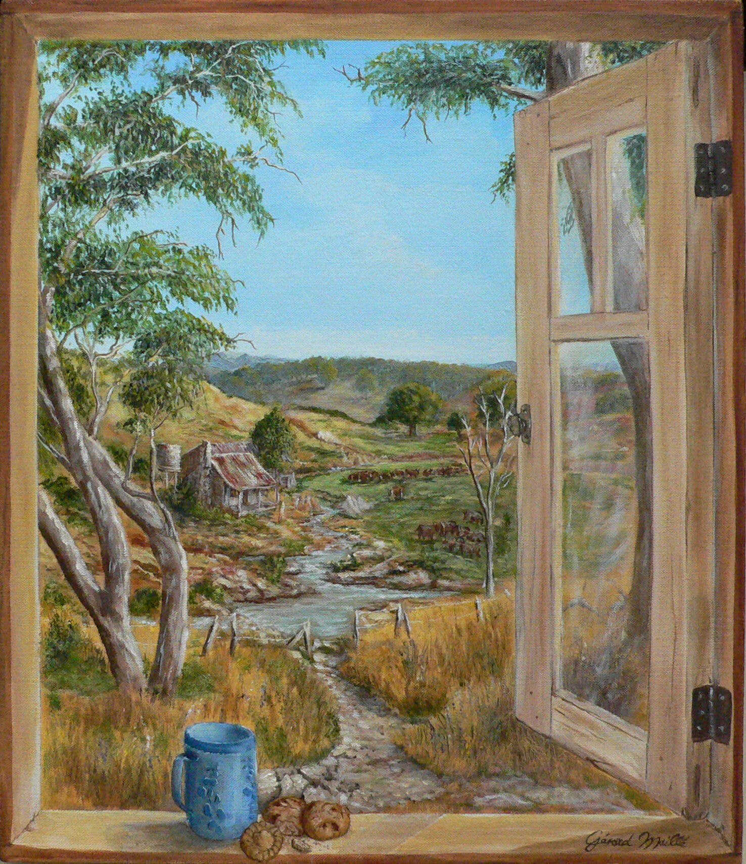 This painting is a window view of a farm scene in outback Australia. In the distance sits an old homestead with a corrugated iron roof and water tank, and cattle are grazing in an adjacent field. A creek meanders through the property, and below the window a stone path leads down to the water's edge. A variety of colours in the landscape creates a feeling of change of season, yet plentifulness for the cattle that are grazing.